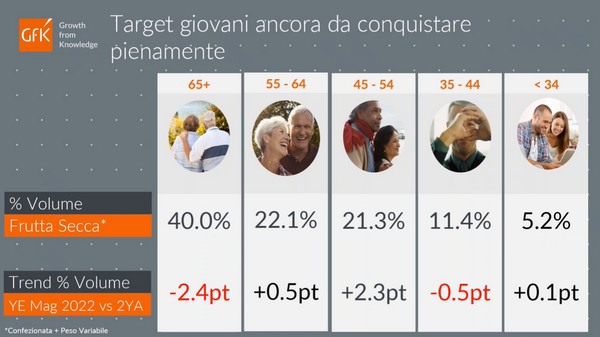 Il mercato della frutta secca (confezionato+peso variabile) è particolarmente concentrato nei target più maturi. "Oltre il 60% dei volumi è sviluppato da shopper di oltre 55 anni - ha sottolineato Pellizzoni - E' perciò ancora tutto da conquistare il target dei giovani. Lo si può fare proponendo innovazione e andando a toccare le giuste corde dei giovani più attenti".