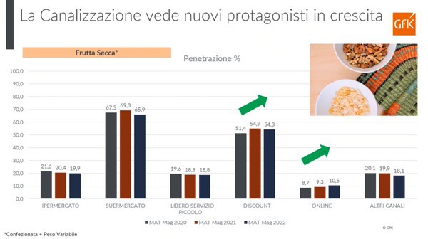 "Negli ultimi due anni, il discount è arrivato quasi al 55% di penetrazione, era al 51% due anni fa. L'online ha raggiunto il 10%. Sono più in contrazione gli altri canali, in particolare gli ipermercati - ha evidenziato Pellizzoni - Per la frutta secca, discount e online sono quindi protagonisti nello sviluppo di penetrazione. E' importante quindi valutare sempre più una presenza omnichannel, investendo su tutti i canali possibili. Essendo lo shopper infedele, se questo non trova la categoria in un punto vendita, il rischio è di perdere un atto di acquisto".