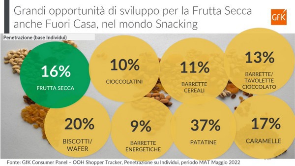 Ci sono grandi opportunità di sviluppo per la frutta secca anche fuori casa, in particolare nel mondo snacking. "Il 16% dell'intera popolazione italiana (circa 60 milioni di individui di qualsiasi età) consuma frutta secca fuori casa. Si tratta di una percentuale che supera categorie molto popolari tra gli italiani, come cioccolatini (10%), barrette ai cereali (11%), barrette/tavolette al cioccolato (13%), barrette energetiche (9%) e si avvicina al dato registrato da biscotti/wafer (20%). L'obiettivo per la frutta secca è di avvicinarsi al 37% di penetrazione delle patatine".
