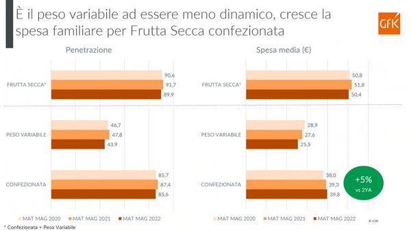 "La frutta secca è una categoria che in termini di penetrazione, frequenza e spesa media è importante, per il punto vendita. Mediamente una famiglia italiana spende 50 euro per frutta secca, confezionata o a peso variabile. Nell'ultimo anno, però, questa categoria non ha mostrato segnali di crescita, che sono più evidenti invece l'anno scorso, in particolare per penetrazione e spesa media. Dopo due anni molto positivi, ora si registra una normalizzazione o una contrazione di mercati, per via dei fenomeni inflattivi".