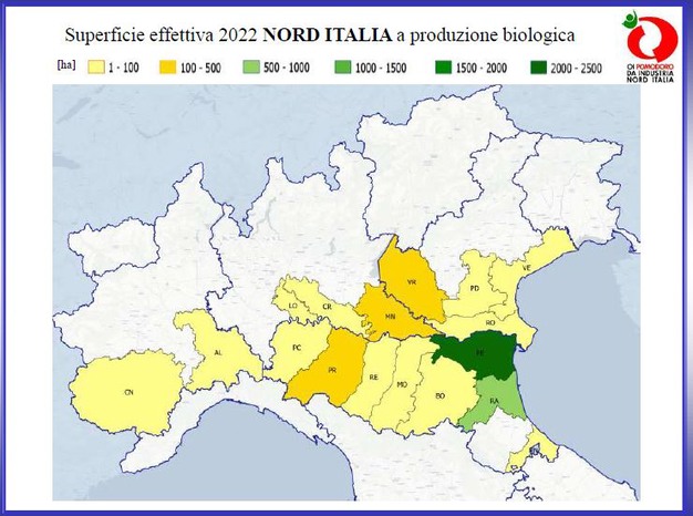 La campagna del pomodoro da industria 2022 ha preso il via nel Nord Italia con la raccolta e la consegna agli stabilimenti di trasformazione delle produzioni di "pomodorino" e i primi quantitativi di varietà di "tondo" precoce. Gli ettari coltivati nelle regioni del Nord Italia per l'anno in corso risultano pari a 37.024 ettari, in calo del 4% rispetto allo scorso anno, soprattutto nelle province dell'Emilia occidentale, ma superiori alla superficie media coltivata dell'ultimo quinquennio. Le superfici di pomodoro in biologico raggiungono l'11% delle superfici totali, consolidando e incrementando il trend degli ultimi anni.