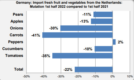 Nei primi sei mesi di quest'anno, la Germania ha importato quantità inferiori di tutti i prodotti più importanti: banane -9%, pomodori -17%, mele -14%, cetrioli -10%, arance - 12%, angurie -25%, peperoni quadrati -6% e mandarini -6%. Solo le importazioni di uva da tavola sono rimaste invariate. Diversi prodotti hanno mostrato sostanziali decrementi, come cipolle -28%, limoni -16% e carote -39%. I prodotti che hanno mostrato incrementi sono stati pochi: pesche/nettarine, avocado, meloni e cavolfiori/broccoli.