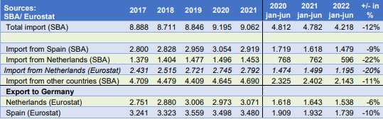 Secondo la CBS tedesca (SBA), nella prima metà del 2022, la Germania ha importato 970mila tonnellate di frutta e verdura fresca dai Paesi Bassi, il 20% in meno rispetto alle 760mila tonnellate della prima metà del 2021. Questa fonte mostra le importazioni dal Paese di coltivazione. In questo caso, le importazioni di prodotti coltivati nei Paesi Bassi.