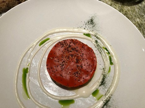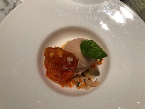 Lo chef ha esaltato la bontà del gusto dei pomodori TSI Italia, accogliendo gli ospiti con una degustazione di caviale di olio e basilico che arricchiva il carpaccio di pomodori: Top Zohar, midi plum tigrato con striature verde scuro, dal sapore umami; Degustibus, midi plum rosso intenso e di grande bontà; Fanello, datterino rosso con grado brix molto elevato.