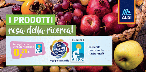 Dal 3 al 30 ottobre, i punti vendita ALDI si colorano di solidarietà con l'iniziativa "I prodotti ROSA della ricerca". Per ogni acquisto di melagrane, mele, uva bianca senza semi contrassegnati dal bollino AIRC e di Farro riconoscibile dalla confezione rosa, ALDI donerà un contributo di 0,21 € a favore di AIRC per sostenere la ricerca scientifica sui tumori al seno.
