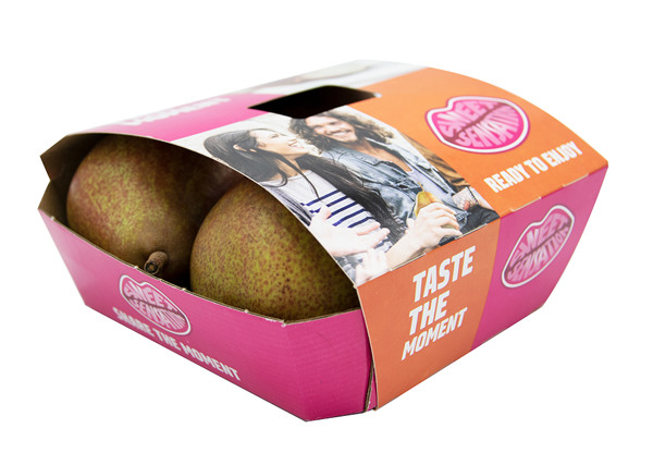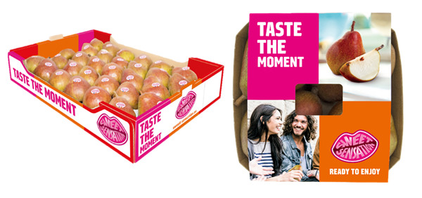 "Quest'anno la Sweet Sensation si presenta in una nuova veste. Dopotutto, le indagini sui consumatori dimostrano che la pera è più un frutto da concedersi che un frutto che si consuma per abitudine. Stiamo quindi spostando l'attenzione sul sapore e creando un look fresco che si adatti a un consumatore più giovane. Sweet Sensation è anche un marchio internazionale, quindi si è optato per uno slogan in inglese, ovvero ‘Taste the moment’ (assapora il momento, ndt). Il restyling è stato implementato sia nella confezione da 4 Sweet Sensation che nella scatola di cartone (prodotto sfuso).