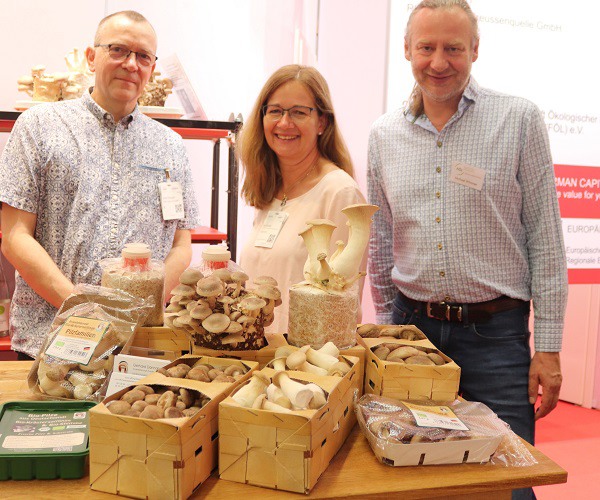 Gerhard Dannapel (a sinistra) di Lan Bio Funghi Land, il Segretario di Stato all'Agricoltura del Brandeburgo Anja Boudon (al centro) e l'amministratore delegato di FÖL Michael Wimmer (a destra). Foto: FÖL e.V.