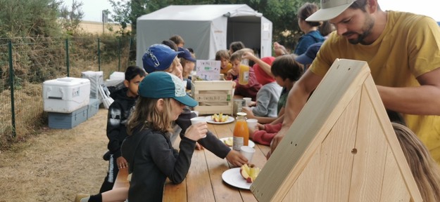 Workshop con alcuni bambini di Ekölo: i produttori della Swing sono venuti ad animare laboratori sulla biodiversità e sulle interazioni tra piante e insetti (luglio 2022).