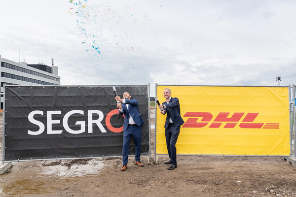 Eelco Ouwerkerk di Segro Nederland (a sinistra) e l’amministratore delegato della DHL, Henk Venema (a destra), festeggiano l’avvio del cantiere.