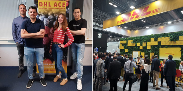 A sinistra: il team della DHL ACE per il trasporto aereo. A destra: lo stand della DHL al Fruit Attraction