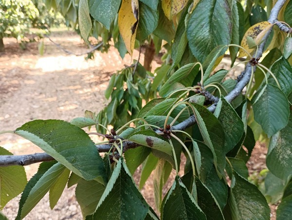 Stato attuale delle foglie su una pianta di ciliegio in Puglia.