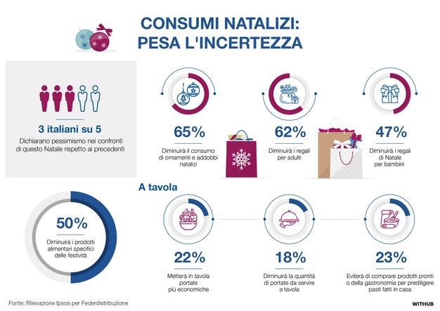 "Gli italiani, a causa del difficile contesto economico che stiamo vivendo, prevedono di ridurre sensibilmente i consumi legati al periodo natalizio: il 65% dichiara di voler diminuire l'acquisto di ornamenti e addobbi natalizi, il 62% spenderà meno per fare regali destinati a persone adulte, il 50% taglierà l'acquisto di prodotti alimentari tipici delle festività e il 47% ridurrà la spesa dedicata ai regali per i bambini. Un quadro preoccupante, che potrebbe anticipare l'inizio di un periodo di vera e propria crisi dei consumi nei primi mesi del 2023. Per questo è urgente che il Governo dia priorità al sostegno delle imprese e delle famiglie, tutelando specialmente le fasce a reddito più basso, per prevenire un rallentamento della domanda interna che potrebbe minacciare le prospettive economiche del sistema Paese" conclude Buttarelli.