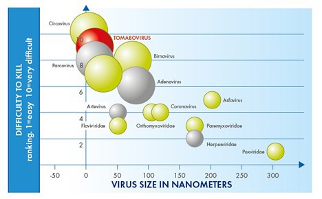 Sopra: classificazione della sensibilità dei virus ai disinfettanti (Foulon, 2019) che mostra quanto il Tobamovirus (in rosso) sia difficile da eliminare.