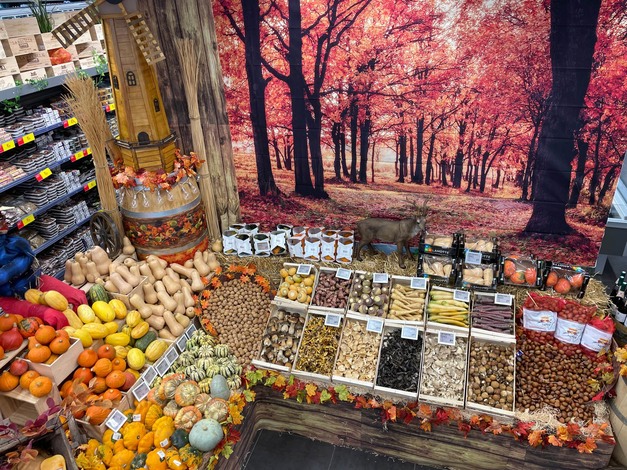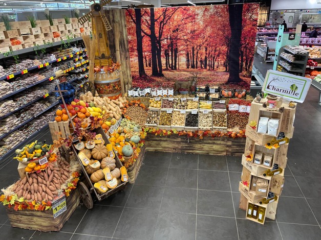 Al supermercato Intermarché di Sarreguemines (Francia nord-orientale), il reparto ortofrutta ha allestito il tanto atteso display autunnale, che darà ai prodotti stagionali un posto di rilievo. "L'obiettivo delle nostre esposizioni è triplice: rivendicare una vera e propria identità, promuovere l'immagine del nostro punto vendita presso i clienti, nonché mettere in evidenza i prodotti di stagione e incoraggiarne le vendite".