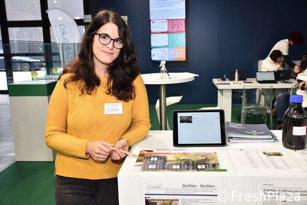 La ricercatrice Martina Bonadio ci ha illustrato il funzionamento del biofiltro presso il visitatissimo stand del Centro Laimburg alla fiera Interpoma 2022.