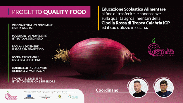 Trasferire agli studenti degli istituti d'istruzione superiore alberghiero, agrario e professionale, aspiranti chef, operatori dell'accoglienza ed artigiani della terra e del gusto, le conoscenze sulla qualità agroalimentare, sulle proprietà dal punto di vista nutrizionale e sull'impiego che se ne può fare in cucina della Cipolla rossa di Tropea Calabria IGP, icona del Made in Calabria, tra gli ingredienti principe della Dieta Mediterranea e alimento prezioso anche dal punto di vista salutistico. E' questo l'obiettivo di Quality Food, il progetto di educazione alimentare nelle scuole che toccherà ben 6 città calabresi.