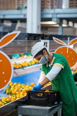 A destra: un'operatrice della Op Agricor, alle prese con la selezione e il confezionamento delle clementine.
