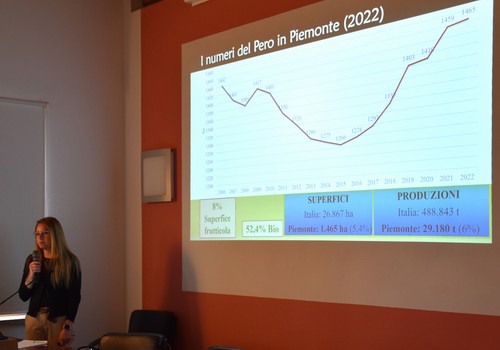E' seguito poi l'intervento della ricercatrice Valentina Roera che ha descritto la situazione del pero in Piemonte iniziando dall'inquadramento delle superfici: attualmente gli ettari coltivati sono 1465 di questi circa il 52% è a conduzione biologica.