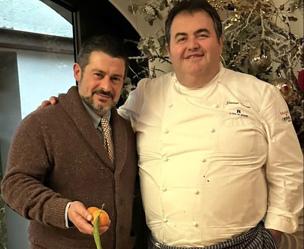 Sopra: il panettone DolceClementina, ideato dallo chef stellato. Sotto: Marco Eleuteri insieme allo Chef Gennaro Esposito. Hanno partecipato alla presentazione/degustazione due giornaliste enogastronomiche: Margo Schachter (Cucina Italiana e Vanity Fair) e Cristiana Curri (Cucina & Vini).