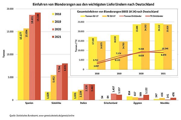 Le Navelina spagnole hanno dominato il mercato tedesco delle arance bionde. Sono state disponibili anche quelle dall'Italia, e le Delta Seedless, Valencia Late e Midknight dal Sudafrica. A Monaco sono arrivate anche le Newhall dal Portogallo. Secondo l'ultimo rapporto di mercato BLE, in particolare le importazioni dall'estero spesso sono state vendute rapidamente, grazie ai loro prezzi bassi. In casi isolati, sono diventate più costose nel corso della settimana, a causa del calo dei volumi. Nel complesso, la commercializzazione è stata piuttosto fiacca.