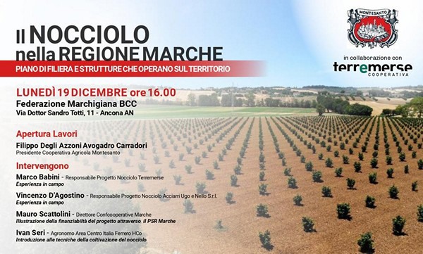 Il nocciolo al centro dell'attenzione degli operatori delle marchigiani. Lunedì 19 dicembre alle ore 16, presso la Federazione Marchigiana Bcc (via Dottor Sandro Totti 11, Ancona) si terrà un convegno relativo alla coltivazione del nocciolo e alle prospettive nel territorio marchigiano.