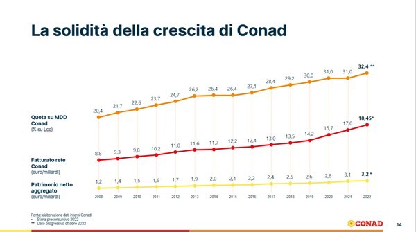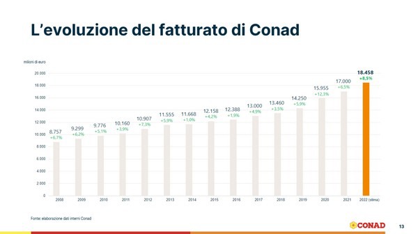 "Il 2022 di Conad si chiude con numeri di cui siamo fieri. Il nostro fatturato è cresciuto dell'8,5% e stimiamo che arrivi a fine anno a 18,4 miliardi di euro. La nostra quota di mercato è salita ancora, al 15,03% nel primo trimestre. I nostri prodotti a marchio continuano ad avere successo, con una quota sul Largo consumo confezionato del 32,4% a ottobre". Così scrive Francesco Pugliese, amministratore delegato di Conad, attraverso il suo account LinkedIn.