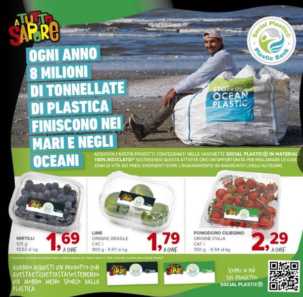 L'iniziativa è presente anche negli attuali volantini promozionali della catena distributiva: mirtilli, lime brasiliani e pomodori ciliegino italiani della linea "A tutto sapore" vengono proposti nelle confezioni Social Plastic.