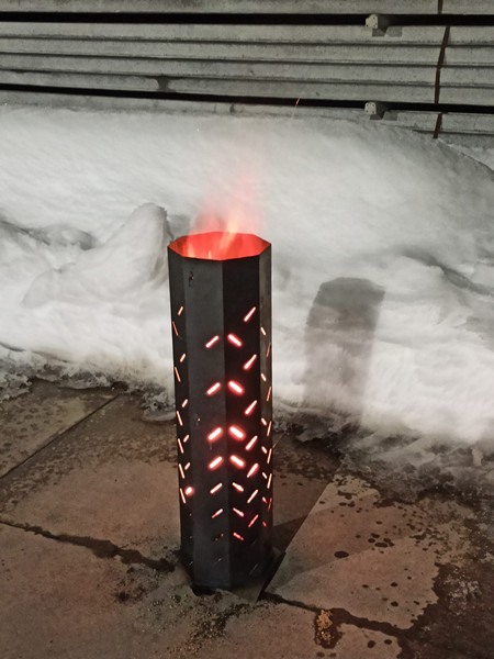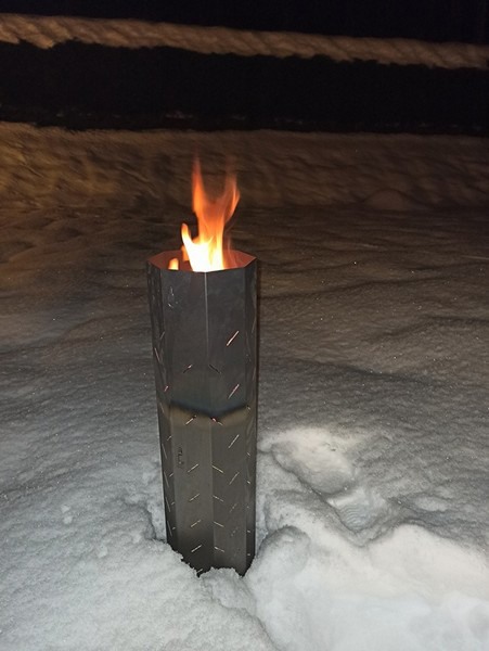 Il bruciatore ha forma ottagonale, è in lamiera spessa e accumula calore rilasciandolo lentamente. E' alimentato a pellet e ogni 'carica' di combustibile ha una durata di circa 8-9 ore: quanto basta per la protezione delle colture ogni notte.