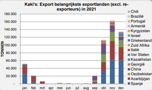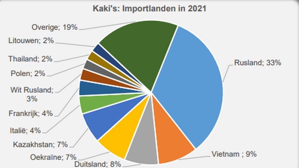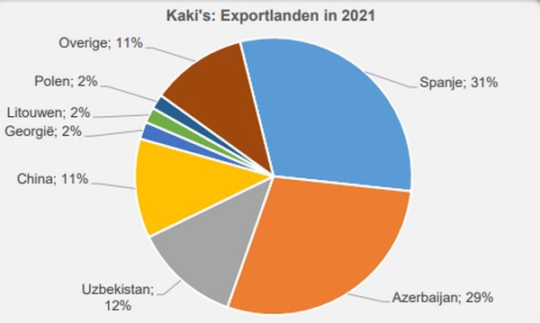 Secondo i dati Eurostat, nel 2021 i Paesi Bassi hanno importato 4.800 ton di kaki. Nel 2020 superavano le 6.400 ton, e 7.300 ton nel 2019. I tre quarti delle importazioni sono arrivati dalla Spagna, seguiti da Sudafrica e Germania, anche se con volumi limitati, rispettivamente 540 e 500 ton.