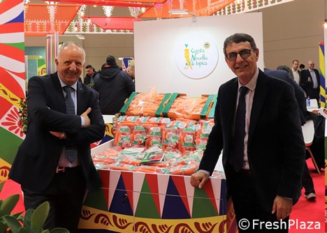 Massimo Pavan e Carmelo Calabrese, rispettivamente presidente e vicepresidente del Consorzio Carota Novella di Ispica Igp, in una foto scattata alla Fruit Logistica (edizione.2023) di Berlino