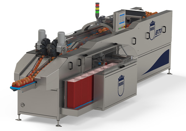 La riempitrice di vassoi è una soluzione progettata da Burg per riempire automaticamente e continuamente piccoli vassoi con prodotti rotondi, come le mele. E' adatta a vaschette di diverse dimensioni. Il funzionamento della macchina è il seguente: i vassoi/cestini vengono posizionati automaticamente sul nastro trasportatore inferiore della macchina (un sistema che fa parte della riempitrice di vassoi). I prodotti destinati ai vassoi si incontrano all'estremità della macchina. Tramite le ruote separatrici, i prodotti vengono posizionati in modo rapido nei vassoi/cestini, che vengono alimentati dal basso.