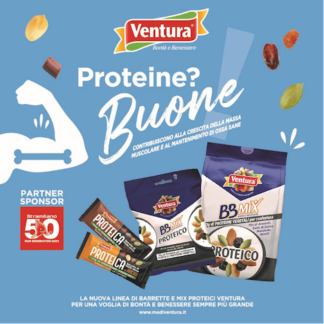 Un mix bilanciato di frutta secca, frutta essiccata e semi, fonte naturale di proteine vegetali (40 g di proteine vegetali per confezione da 150 g) e una linea di barrette di frutta secca disponibile in due varianti, al cioccolato e con arachidi, con 10/11 grammi di proteine vegetali per barretta da 50grammi. Queste le referenze della nuova linea "Proteica" del marchio Ventura.