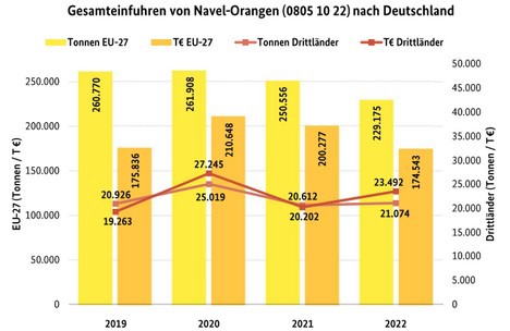 Le offerte spagnole hanno continuato a prevalere sui mercati tedeschi. Oltre a Lane Late e Navelate, sono state soprattutto disponibili le Navel e Salustiana. Secondo il rapporto BLE della settimana 12 del 2023, la presenza dell'egiziana Valencia Late si è nettamente ampliata e anche la turca Washington Navel ha acquisito importanza. La prima Valencia Late dalla Turchia costa a Francoforte 12,50 euro per confezione da 9 kg. Nel complesso, le arance bionde marocchine e italiane non sono andate al di là di un carattere complementare.