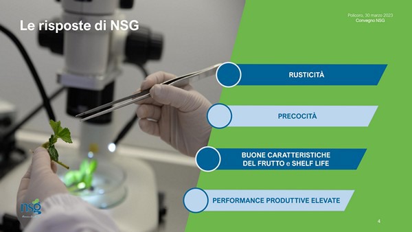 "Le risposte che dobbiamo fornire come società di ricerca e sperimentazione devono essere concrete, capaci di risolvere in tutto o in parte queste sfide. Il nostro obiettivo è quello di selezionare varietà che abbiano rusticità, precocità, buone caratteristiche del frutto e performance produttive elevate. Il concetto di rusticità è fondamentale, in una cultivar, poiché vuol dire avere selezioni che siano in grado di adattarsi all'andamento climatico che sta caratterizzando e mettendo in difficoltà gli agricoltori, specie negli ultimi anni: temperature medie invernali miti, sbalzi termici notevoli, sono problematiche che vanno a sommarsi alle forti riduzioni delle disponibilità idriche e, quindi, a un peggioramento della qualità delle acque irrigue".
