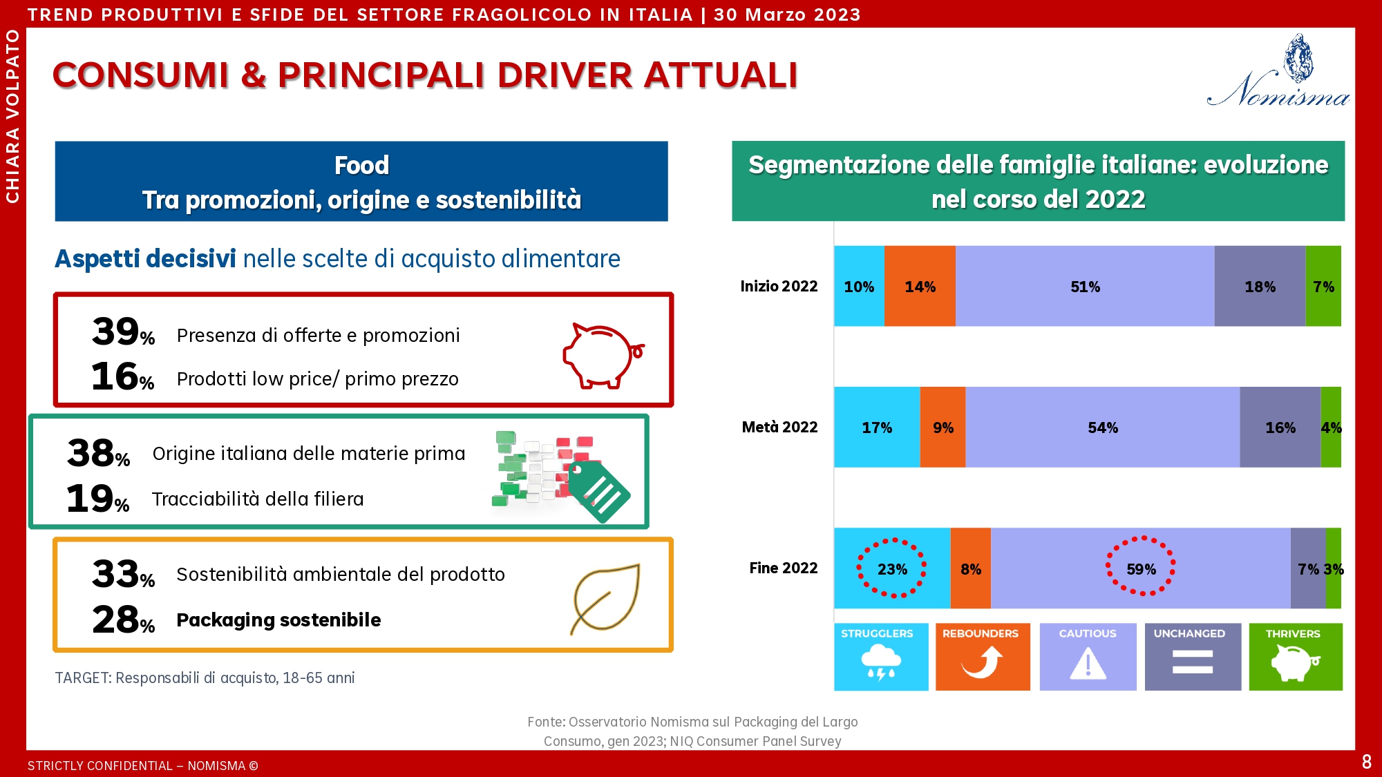 È un messaggio quindi positivo, per questo articolo, che rimane presente sulle tavole degli italiani nonostante i comportamenti di acquisto adottati per contrastare il caro-vita. Inoltre, malgrado l'ampliamento del calendario produttivo, grazie soprattutto all'innovazione varietale, il 90% delle fragole è oggetto di acquisto nei mesi che vanno da marzo a giugno. Pertanto, il consumo di questo articolo è ancora fortemente legate alla stagionalità.