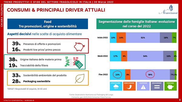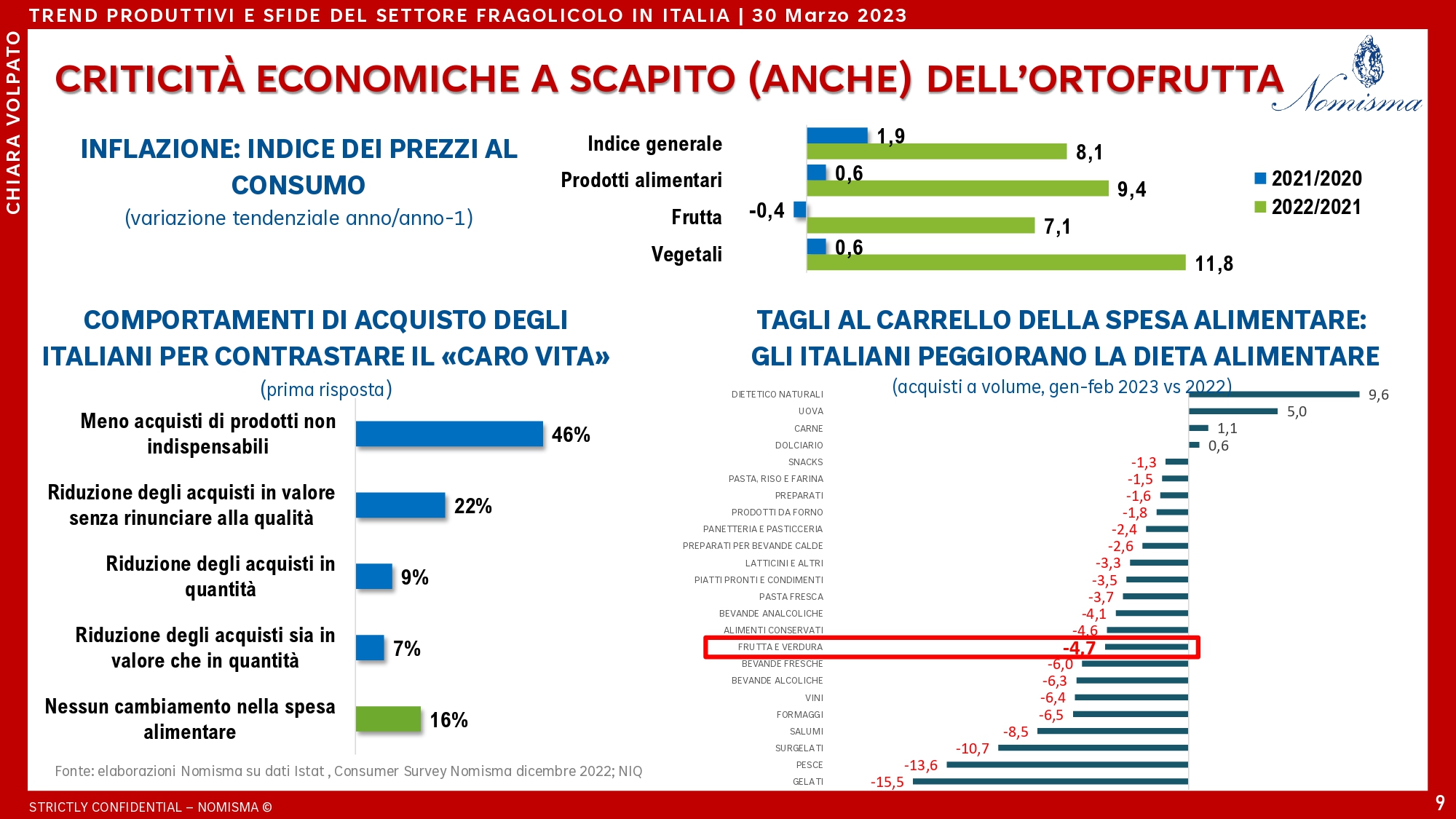 Criticità economiche che hanno avuto impatti anche nell'ortofrutta, seppure in modo diverso a seconda degli articoli, con una riduzione degli acquisti a volume pari al 4,7% (periodo gennaio/febbraio 2023 rispetto al 2022).