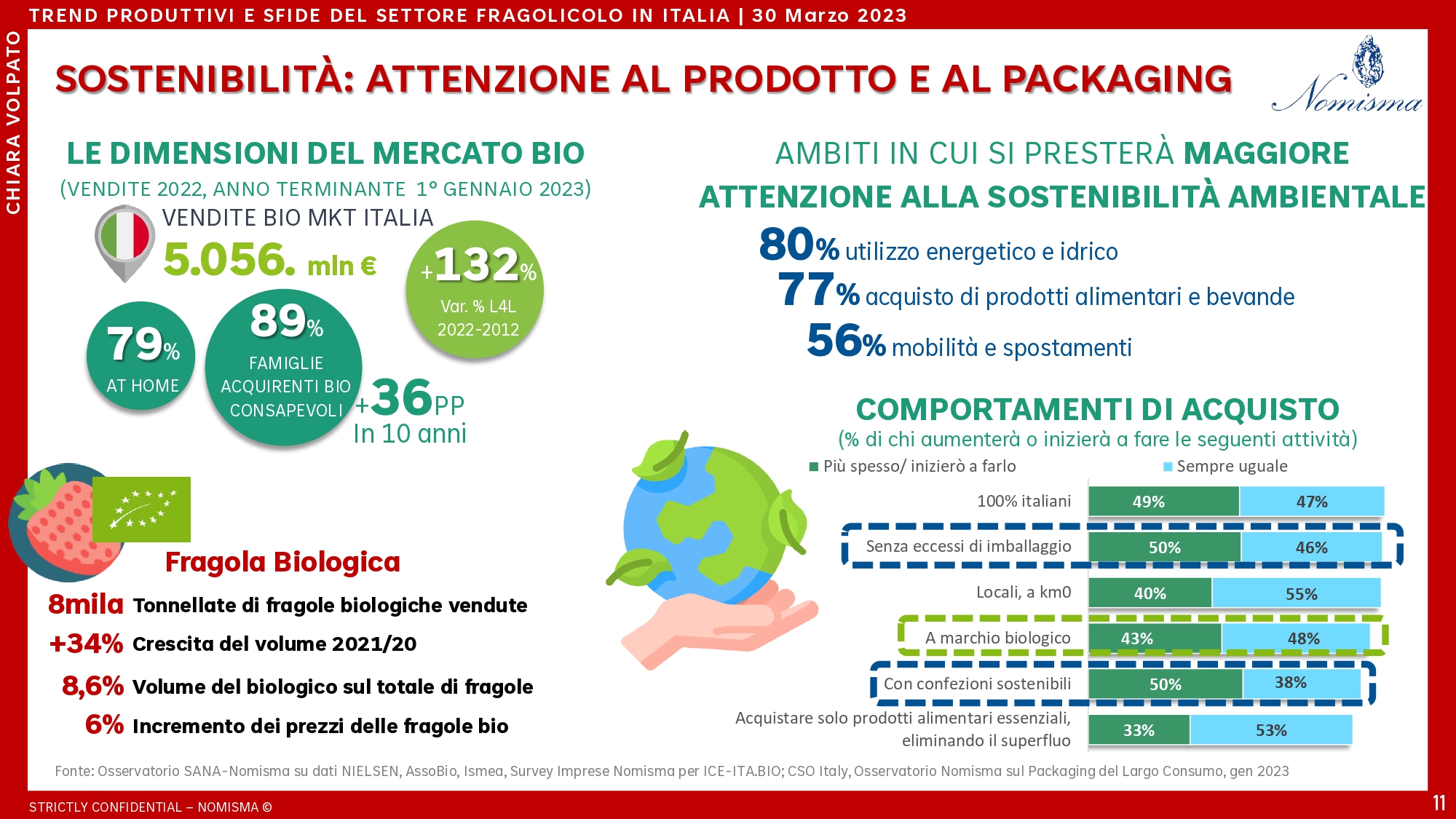 L'inflazione ha dato poi una spinta generale ai discount, punti vendita che nel settore della vendita alimentare tornano a crescere. Per quanto non rappresenti il primo canale, le fragole vengono vendute per il 21% nei discount. Per quanto riguarda il biologico, nella fragolicoltura esso rappresenta ancora una nicchia, ma i volumi stanno gradualmente crescendo.