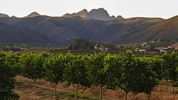 Agrumeti di fronte al picco Hanekam (a cresta di gallo) dei monti Groot-Winterhoek, Capo Orientale