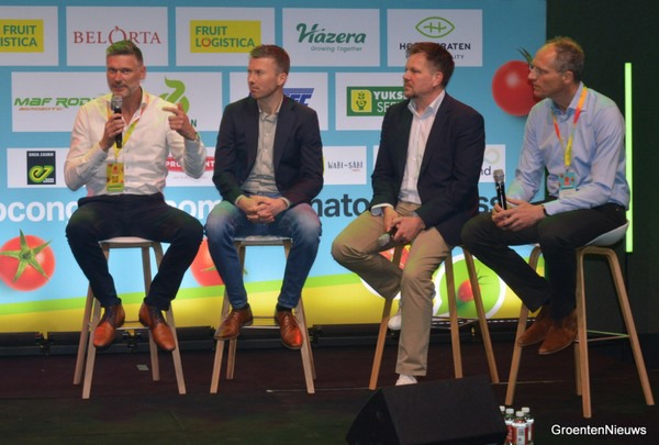 Dopo la prima pausa, sono saliti sul palco quattro esperti del settore. Dirk Aleven di FoodVentures, Imre Vellenga di Agro Care Growers, Philippe Appeltans di BelOrta e Adam Davy di ICA hanno dato vita a un vivace dibattito sulle sfide che il mercato del pomodoro deve affrontare e su come l'industria dovrebbe rispondere. Philippe ha affrontato il tema della carenza di pomodori nel Regno Unito, durante l'inverno precedente, e ha auspicato la creazione di un maggior numero di organizzazioni di produttori inglesi per incoraggiare i supermercati a pagare prezzi equi per i pomodori. Philippe ha osservato che, nonostante la disponibilità di pomodori di BelOrta, si sono verificate carenze a causa di un prezzo leggermente più alto. Ha riassunto la situazione come "penny wise, pound foolish (il penny saggio, la sterlina sciocca, ndt)".