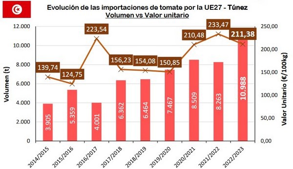 I pomodori tunisini hanno ottenuto 211,38 euro per 100 kg e sono stati l'unica origine a registrare una riduzione (-9,5%) del valore dei pomodori rispetto alla scorsa stagione. Il loro valore, tuttavia, è stato superiore del 16,8% rispetto alla media.