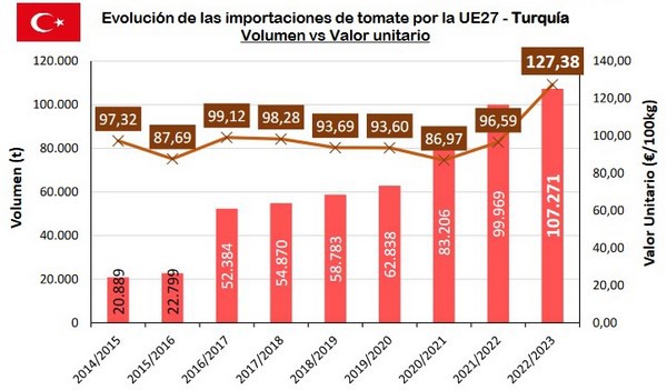 Il valore medio dei pomodori turchi si è attestato a 127,38 euro per 100 kg, con un aumento del 31,9% rispetto all'anno precedente e del 35,8% rispetto alla media degli ultimi cinque anni.