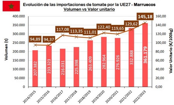 Il valore dei pomodori marocchini importati nell'Ue si è attestato a 145,18 euro per 100 kg nel periodo analizzato, con una crescita del 12% rispetto allo scorso anno e del 21,8% rispetto alla media degli ultimi 5 anni.