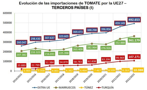 Tra settembre 2022 e febbraio 2023, l'Ue ha importato 492.653 tonnellate di pomodori dal Marocco, un volume che ha rappresentato il 73,3% del totale importato e che è stato superiore dell'8,5% rispetto allo stesso periodo della campagna 2021/22 e del 30,7% rispetto alla media delle ultime cinque campagne. Il Marocco è seguito dalla Turchia con una quota del 21,8%, un aumento del 7,3% rispetto alla campagna precedente e del 49,1% rispetto alla media. La Tunisia si è classificata al terzo posto con una quota più modesta, ma con un aumento del 33% rispetto alla campagna precedente e del 48,2% rispetto alla media.