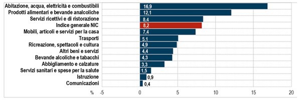 Nel loro insieme i prezzi dei beni alimentari rallentano la loro crescita (da 12,9% a 11,8%; +0,3% il congiunturale), per effetto sia dei prezzi degli alimentari lavorati (che passano da 15,3% a 14,0%; +0,5% su base mensile) sia di quelli degli alimentari non lavorati (da 9,1% a 8,4%; +0,2% rispetto al mese precedente).
