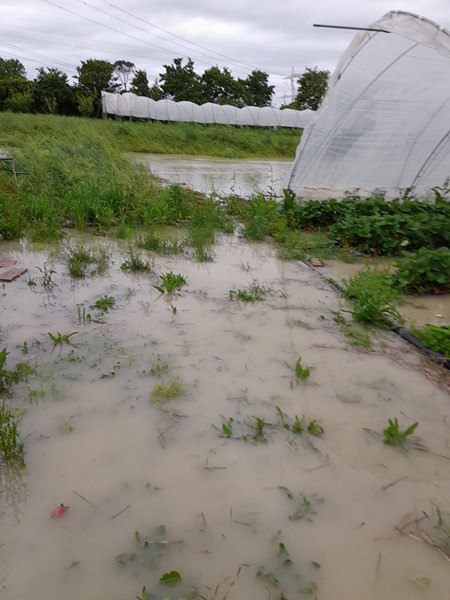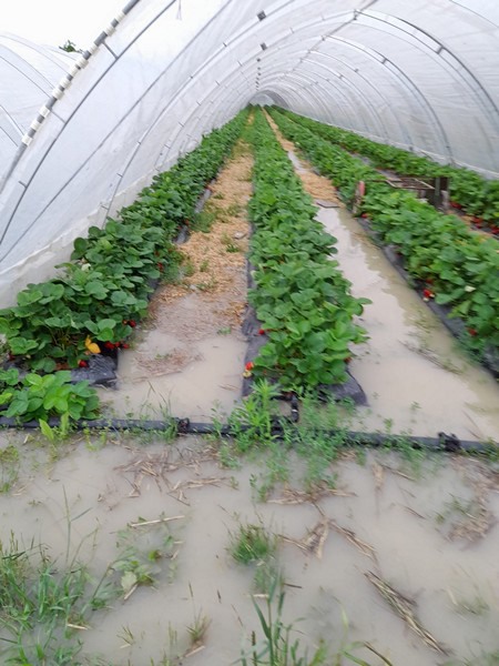 Danni notevoli anche agli impianti di fragole, in piena produzione: le piante sono sott'acqua da lunedì scorso ed effettuare la raccolta è quasi impossibile.