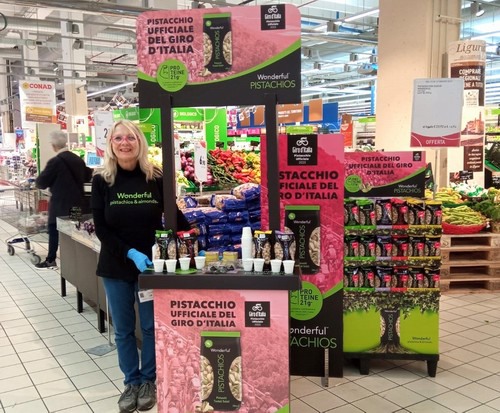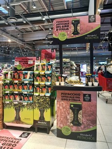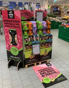 Si parte con l'allestimento dei punti vendita: qui sono stati posizionati materiali POP specificamente dedicati al Giro d'Italia associati all'attività promozionale. Le confezioni sono ospitate in display di prodotto a sfondo rosa, l'iconico colore della corsa. Ben in evidenza è l'informazione "Proteine 21 g", che precisano allo shopper che 100 grammi di pistacchi Wonderful contengono 21 grammi di proteine, che contribuiscono alla crescita della massa muscolare. Su ogni singola confezione di prodotto è stato anche apposto lo sticker dedicato sempre al Giro d'Italia.