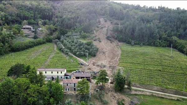 Una delle innumerevoli frane nell'Appennino romagnolo (questa a Modigliana) causate dalle piogge torrenziali