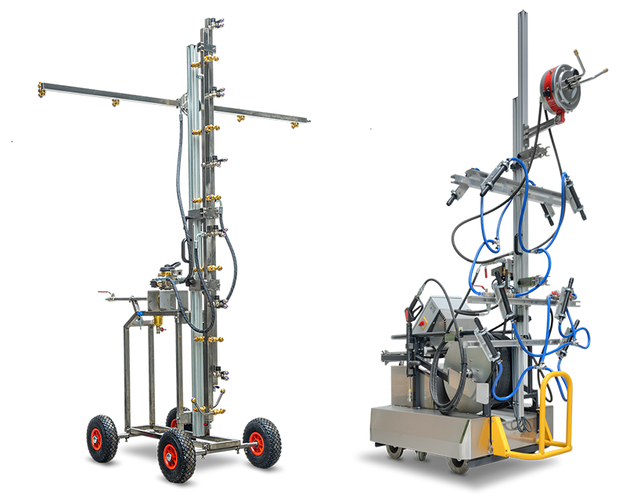 LM-03 (barra irroratrice manuale su rotaia e barra irroratrice orizzontale aggiuntiva) e AST-02HR + pacchetto di pulizia aggiuntivo per la pulizia/lavaggio interno delle serre.