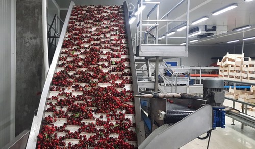 Le ciliegie, prima della lavorazione, vengono collocate in celle ozonizzate. Successivamente, si passa alla lavorazione: il prodotto viene smistato dalla calibratrice per dimensioni, ottenendo i vari calibri (dal 26+/28+/30+/32+/34+ fino ad arrivare a calibri importanti come 36+/38+/40+, pochissima quest'ultima livello campionario).