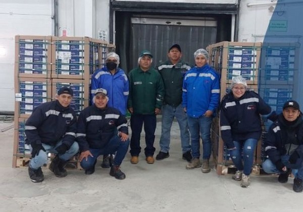 Il team di Verfrut con le prime casse spedite in Uruguay per la stagione 2023/24 dei mirtilli peruviani.
